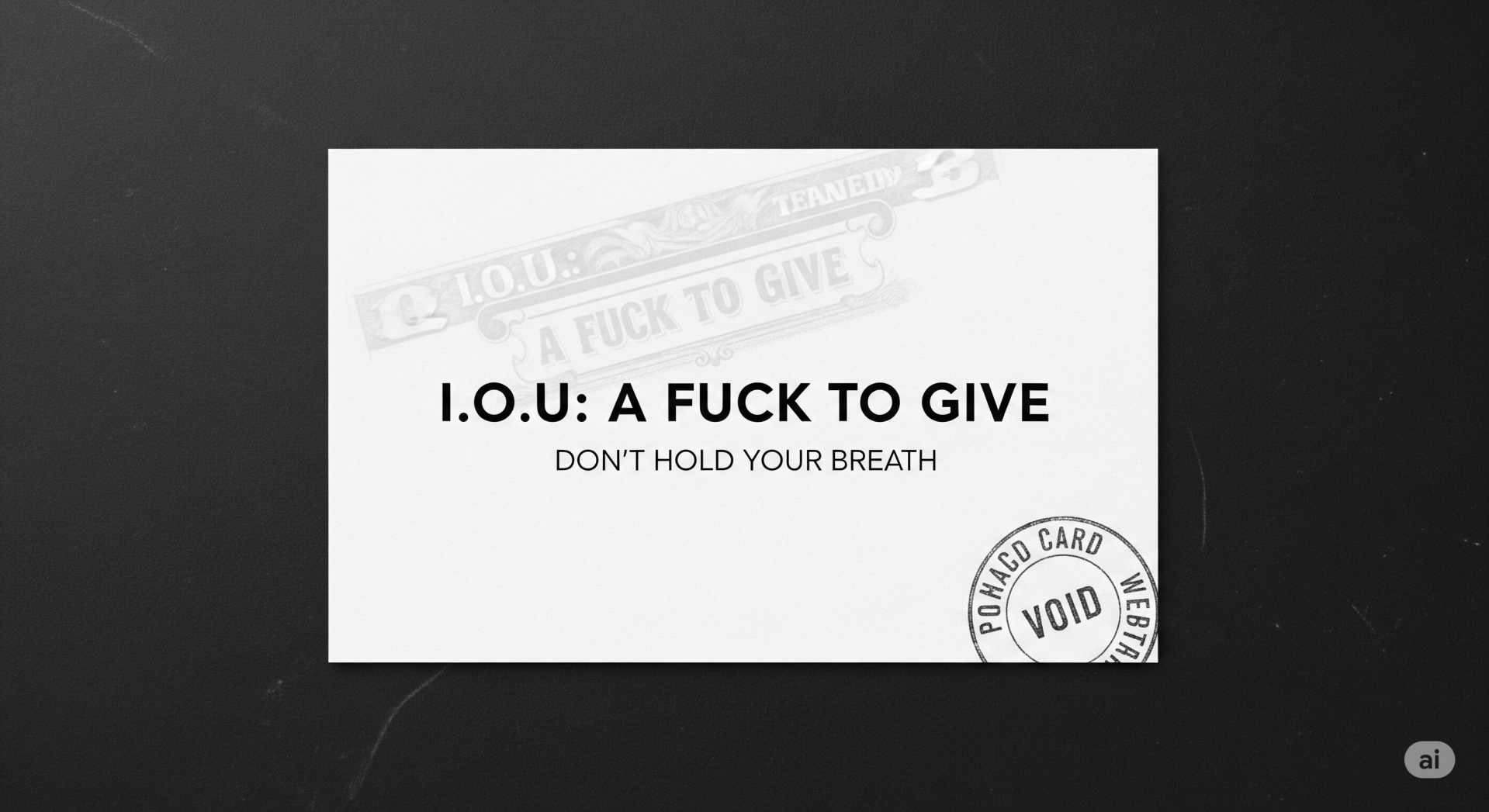 You asked, we didn't deliver. Presenting the revolutionary "I.O.U.: A Fuck to Give" – the cutting-edge non-product for those who demand ultimate disappointment.