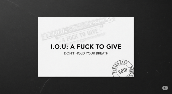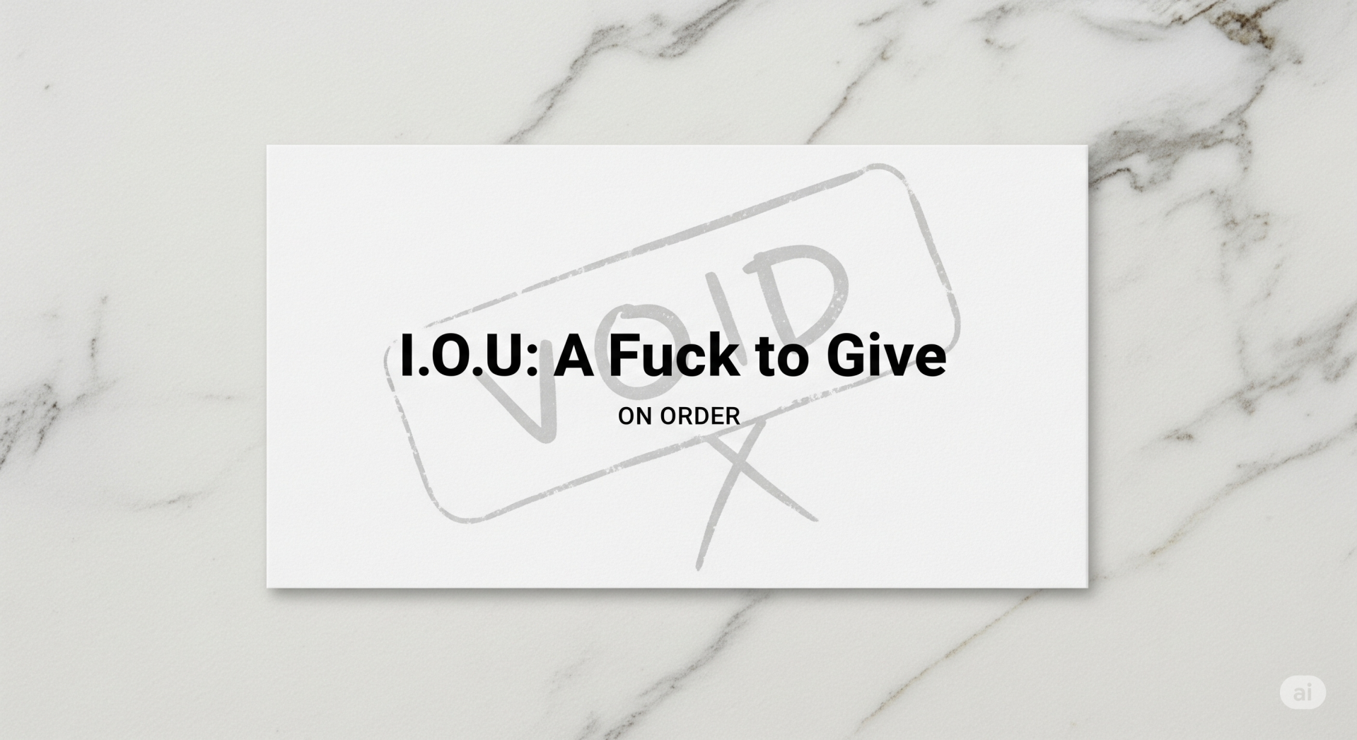 Perfect for situations where you desperately wish you had a fuck to give, but deep down, you know that ship sailed a long, long time ago. Whether it's for that overly dramatic email chain, your neighbor's questionable lawn ornaments, or another poorly reasoned opinion piece, this I.O.U. ensures you can confidently remain unburdened by empathy.